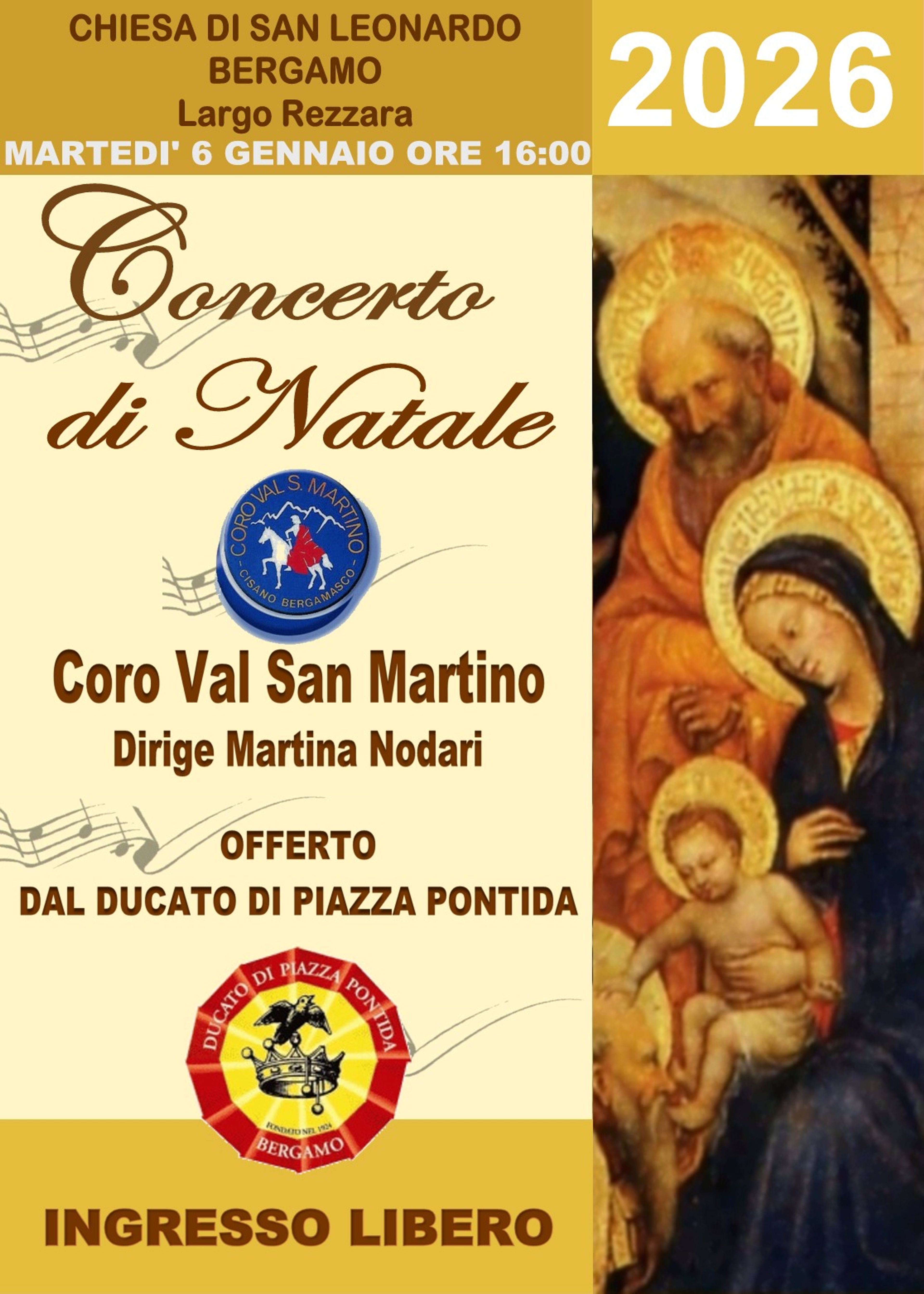 Il Ducato di Piazza Pontida è lieto di offrire alla cittadinanza il Concerto di Natale, in programma martedì 6 gennaio 2026 alle ore 16:00, nella suggestiva Chiesa di San Leonardo, in Largo Rezzara a Bergamo.